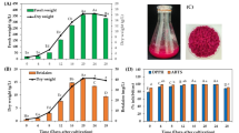 Betalain production using plant cell culture has been of particular interest due to several notable advantages, including bioactive properties, consistent production independent of seasonal and geographical locations, and the generation of safe pigments5,15. In this study, red friable calli with fast-growing characteristics were cultivated in semi-solid MS medium supplemented with 1 mg/L 2,4-D and 0.1 mg/L BAP for establishing cell suspension cultures. The growth pattern of C. argentea var. plumosa calli in liquid medium under normal conditions supplemented with 3% sucrose (w/v), 1 mg/L 2,4-D and 0.1 mg/L BAP revealed that TBC and DW reached their peak on day 15 with values of 35.61 mg/L (1.95 mg/g DW) and 19.90 g/L, respectively (Fig. 1A). After day 15, the biomass decreased, possibly due to nutrient depletion. The 15-day-old friable calli grown on semi-solid and liquid medium (Fig. 1B and C) showed the same red coloration. This phenomenon indicated that cells grown in different medium types (semi-solid vs. liquid) retained the ability to synthesize and accumulate betalain compounds, indicating a stable cell line. This characteristic suggests that the regulatory mechanisms controlling betalain production in C. argentea var. plumosa are robust and not significantly affected by physical medium properties, which is crucial for further applications where consistent pigment production is essential.