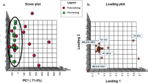 A total of 945 species were detected across 12 participants, with one participant and its four associated measurement timepoints excluded due to unsuccessful venous blood sampling after the ice bath. To eliminate the need for imputation, only lipids from measurements without missing values were included. The final set consisted of 305 lipids measured over 64 plasma samples. The data of the lipid concentrations was log2 transformed, to achieve an approximate normal distribution. The resulting normal distribution was validated by using QQ-plots (Supplementary material 1). This resulting dataset was subjected to principal component analysis (PCA). PCA transforms the data into new variables called principal components (PCs), which are ranked based on how much information (variance) they capture from the original dataset. By projecting the data onto the first two components – capturing 32.8% and 17.6% variance, respectively – we reduce the dimensionality from 305 to two, but retain a significant part of the original data’s variation. Samples were color-coded based on their fatty acid (FA) composition to assess trends along the axes of greatest variation. Time-of-day information (morning or evening) was also annotated on the PCA plots through differing shapes. Additionally, measurements from individual participants were connected in PCA space to highlight intra-individual variability, with areas formed by these connections used as surrogates for intra-individual variance. This facilitates a visual inspection of the dataset. The code to reproduce the PCA analysis’ figure can be retrieved from: https://doi.org/10.5281/zenodo.13322184. The blood lipid composition data was statistically analysed to investigate time-of-day and sex differences with repeated measures two-way ANOVA. A general linear model was used if there were no missing values and a mixed effects model with maximum likelihood method if there were missing values. Fisher’s least significant difference test was used to make multiple comparisons and Greenhouse-Geisser correction to adjust for lack of sphericity. For the statistical analysis of the plasma lipid concentrations, the z-scores for each lipid concentration were calculated using the formula: Z = \(\:\frac{(x\:-\mu\:)}{\sigma\:}\). Two-tailed t-tests were computed between all measurement timepoints for the plasma fatty acid concentrations (Z-scores). Pearson’s R was computed to investigate the relationship of any increased catecholamine data in response to the ice bath with changes in blood lipid concentrations.