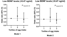 In the present study, no associations were observed between egg intake and depression. In line with our findings, formerly published studies have reported no association between egg consumption and depression38,39. Evidence also suggests that higher dietary intake of egg components like tryptophan is associated with a lower prevalence of depression40, additionally, B vitamins deficiencies and low consumption of them were associated with greater risk for depression34,41.