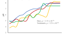 The temperature experienced significant variation across different treatments (p < 0.05). C2 exhibited a notably abrupt temperature rise compared to other treatments, while C4 underwent a sharp transition from the thermophilic phase to the cooling phase. In contrast, C5 displayed a more gradual temperature change than the other treatments. Only C2 maintained a consistently high temperature (50–60 °C) for over a week (Fig. 2A). The abrupt temperature changes in C3 and C4 may be attributed to the presence of saw dust, known for its high water absorption potential, causing rapid temperature fluctuations5. The elevated temperature results from microbial activities30, facilitated by the high surface area of fallen leaves and saw dust31. Control (lacking a bulking agent), failed to achieve a prolonged thermophilic phase necessary for pathogen elimination30. Fallen leaves and sawdust are rich in organic matter (OM) which enhances microbial and enzymatic activity32, and results in rise of temperature33. pH fluctuation was reported between 4.5 and 8.5 during composting process due to various reactions in the compost pile34. pH values were significantly different in all treatments (p < 0.05). C1 gradually shifted from acidic to alkaline pH, while C6 exhibited abrupt pH changes. In C4, pH turned acidic in the mesophilic phase, gradually becoming alkaline (Fig. 2B). C2 maintained an acidic pH for an extended period, possibly due to low mineralization7, high organic acid concentration32, slow degradation of organic N and low OM degradation rate35. C5 and C6 experienced a pH shift towards alkaline as the thermophilic stage approached. This change may be due to high temperatures, aerobic conditions, organic nitrogen mineralization and organic matter degradation14. Electrical conductivity (EC) of mature compost reflects its salt content and is crucial for explaining its impact on plant growth6. EC is directly related to pH values, with the increase in pH the EC also rises35. The high salinity > 4 mS/cm is not good for plants, the EC of final compost should be < 4 mS/cm10. EC values for C2, C3 and C4 remained within a safe range of 0-2.5 mS/cm, while C5, having flyash, had an EC value exceeding 3.5 mS/cm (Fig. 2C). High EC values pose a risk of soil salinity, have potential to harm or even kill the plants28. The higher EC range in C5 may be because the fly ash releases significant amounts of soluble ions36 and can accumulate different ions due to its extensive surface area30.