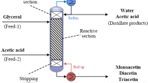 Regarding the transesterification reaction of GL with DMC, Yu and coworkers8,9 studied this reaction using the RD system and compared it to the CSTR (conventional) system. Srivastava et al.10 generated their distillation model based on a residue curve map and compared the proposed model with reactive distillation extractive distillation (RDED) in Yu’s work9 and reactive distillation pervaporation (RDPV) in Sun’s work11. According to Srivastava’s results, their proposed model yielded better results than RDED and RDPV systems in all aspects of process performances.