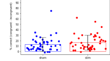 Results of the Kinesthetic, Visual 3rd person, and total scores from the MIQ-3 (Table 2) indicate that there was no significant difference between each group’s ability to participate in mental imagery. Therefore, we can assume that both groups were evenly matched in this regard and ability to mentally imagine likely did not play a role in the outcomes of the intervention. Additionally, the tDCS sensitivity questionnaire results (Table 2) showed that while both groups had similar pre-tDCS sensitivity levels, the MIActive group had lower sensitivity (< 3%) at post-training compared to the MISham group. When these findings are juxtaposed to participant stimulation guesses, there was no greater ability for MIActive over MISham to correctly guess the type of stimulation they received. Therefore, mildly reduced sensitivity in the MIActive group did not seem to influence the outcome.