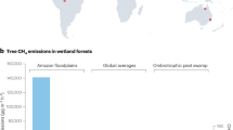 The results from our studies demonstrate that exudates of carbon compounds from roots contributed to methane production and emissions. The 67% decrease in CH4 fluxes following girdling demonstrates that plant root inputs contribute significantly to peat surface emissions. This high apparent proportion of root contribution to surface CH4 fluxes is supported by the approximately two-third contribution of roots to CO2 fluxes we have previously demonstrated at the site46. Girdling will also have driven a reduction in rhizosphere respiration (including root respiration) by reducing the flow of exudates to the roots and peat21. It may also have reduced oxygen consumption within the rooting zone therefore leading to favourable conditions for methanotrophy although plant stem adaptations to supply oxygen to roots (lenticels) which are present for both C. panamensis and S. globulifera may have confounding effects10.