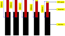 In the present study, thick circular (10 mm dia, 1 mm thick) PZT patches, are protected with a single thin layer of two-part epoxy (Araldite standard epoxy adhesive) to protect the piezo and soldered terminals against the adverse effects of water, and environmental conditions during the construction stages are named as an RJP sensor24. The PZT patches used in this study were confirmed to the properties of PZT-5 A, with a d33 constant of 390 × 10− 12 m/V. This configuration provides a sharp first resonant frequency peak, and the shifting of this peak is measured to estimate the change in concrete strength. A typical view of an RJP sensor is shown in Fig. 1 with the entire experimental setup. A total of 120 RJP sensors were fabricated identically in laboratory conditions. The EMI signatures of the RJP sensors were acquired during three stages of their preparation, namely, (a) raw PZT stage when the PZT was not soldered, (b) soldered PZT patch, and (c) RJP (unbonded) when a protective epoxy layer was added on the soldered PZT. The RJPs were allowed to rest for 24 h, for the curing of the epoxy. The gravity ensures the smooth flow of epoxy over the PZT patch forming a uniform protective layer of 100 μm. The variation of peak conductance and peak frequency in these three stages of RJP sensor fabrication for 120 PZT patches is shown in Fig. 2. It is observed that the peak conductance value of a free PZT patch at the first resonance frequency decreases when its terminals were soldered and it reduces further after the addition of the protective epoxy layer. However, there is a negligible shift in the peak frequency values after soldering the terminals but, the value reduces on adding the epoxy layer as it increases the mass of the system. These results were used for selecting the RJP sensors with similar peak conductance and peak frequency values to ensure consistency among the functioning of the sensors while experimentation. Standard deviation (SD) for each state is calculated for both, the peak conductance and peak frequency. The lower standard deviation in the final state (SD = 0.003) for the peak conductance values proves its better consistency as compared to the peak frequency values. Such high similarity in the peak frequency and simultaneous conductance values aids in understanding the correlation between the shifts and the features to be monitored, which in this case is concrete strength.