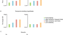Among the rest of primarily hypothesized relationships, only participants’ biological sex had a significant influence on TIP position. Male participants evaluated stimuli in general as lasting a shorter time than females (B = 0.122, p = 0.012, CI 95% [0.030, 0.213], f2 = 0.070). The order of administration of the experiment had a significant effect on overall perception of stimuli duration as well. Whenever Experiment A was administered second, the stimuli caused an expansion of subjective time (B = − 0.146, p = 0.002, CI 95% [− 0.232, − 0.058], f2 = 0.113). We therefore kept this predictor in the model as a control while testing the effect of all other above-mentioned predictors.