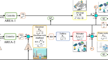 Various authors have reported performance assessments on multi area hybrid power systems within a deregulated scenario. Demiroren et al.8 investigated a deregulated three-area system, analyzing its performance by implementing a continuous parameter Genetic Algorithm (GA) based on real values. However, it is noteworthy that their analysis did not consider any non-linearities in the system. In a separate study, Bhatt et al. explored the response of a deregulated four-area system using hybrid particle swarm optimization9. Notably, they did not incorporate non-linearities into their analysis either. The DISCO participation matrix concept was implemented in both three-area and four-area systems within a bilateral scenario. Nasiruddin10 et al. focused on analyzing AGC in a system with two control area in which the bacteria foraging optimization technique is implemented. Similar to previous studies, they did not incorporate system nonlinearities. To enhance the realism of their analysis, other authors introduced non-linearities such as the generation rate constraint (GRC) and governor dead band (GDB). In a comprehensive examination, Mohanty11 et al. studied the dynamic of a multi-area system under deregulation, specifically considering the impact of the GRC effect. Their analysis included thermal, nuclear, and hydropower units in each area, incorporating GRC and AC/DC links. The study further conducted sensitivity analysis using different controllers, such as integral-double derivative (IDD) and proportional-integral-double derivative (PIDD). Sekhar et al.12 analyzed a multi-area system, considering GDB and GRC. This research highlights the fruitfulness of the novel Firefly Algorithm-tuned hybrid fuzzy PID controller with a derivative filter in a multi-area, multi-source system in a deregulated environment. In this paper the nonlinearities are taken into account while examining the controller’s response under varying loads, different parameters, and random load disturbances. In a separate study, Rosaline et al.13 scrutinized a restructured two-area system that involved GRC and GDB nonlinearities along with boiler dynamics. Their paper introduces a structured H-infinity controller and a redox flow battery implemented in a deregulated power system. The purpose is to showcase the robustness of the controller considering the effects of time delay, generation rate constraint and governor dead band.