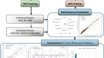Advances in artificial intelligence (AI) have led to the application of machine learning (ML) techniques for the prediction of diverse mechanical and physical characteristics of concrete51. Many machine learning techniques, like as clustering, regression, and classification, can be applied to quantify a variety of additional features to produce dependable compressive strength estimates52,53,54. Gene expression programming (GEP) was employed by Javed et al.55 to forecast the CS of concrete composed of sugarcane bagasse ash. Moreover, ANN was used by Getahun et al.56to forecast the lifespan of concrete that contains leftover components. Moreover, ANNs, ANNs with combined inputs and ANNs with nature inspired optimizers such as particle swarm optimization (PSO), genetic algorithms (GA), beetle algorithms and ant colony optimization have been proposed in the literature in recent years. Combining several soft computing techniques can result in the development of better prediction models, such as artificial bee colony algorithms, PSO, imperialist competitive algorithm, and ANN mixed with GA. These combinations have demonstrated encouraging outcomes in resolving challenging issues, suggesting that these methods could be applied to tasks involving prediction and optimization57,58,59,60. In this regard, Yasmina et al.61used hybrid models that included ANN with additional optimization approaches including PSO and GA to forecast the CS of POFA concrete. Their findings demonstrated that the hybrid ANN models performed better than standalone ANN and other optimization strategies, delivering increased predicted accuracy. Furthermore, a few well-known machine learning techniques, like bagging, support vector machines, Extreme Gradient boosting (XGB), and hybrid machine learning models, are frequently employed extensively in huge amounts of data of CS prediction of SCMs materials62. These tree-based machine learning models are popular ensemble techniques63,64. The mechanical properties of many recently developed advanced concrete types and HSC65,66such as self-healing concrete67, fiber-reinforced rubberized recycled aggregate concrete68,69, UHPC70, and RCA71,72, have been predicted by several studies. Thus, creating a trustworthy database containing pertinent training and test cases is essential. This first step ensures that pertinent data is available for model training and performance evaluation. Data preprocessing, regression analysis and correlation analysis are statistical investigations carried out by gathering datasets from previous studies and extracting important information that directs the creation of sophisticated ML models73.
