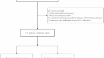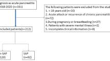 Demographic characteristics were collected post-admission. Blood biochemical indicators, including blood cell count (WBC), C-reactive protein, procalcitonin (PCT), liver function, renal function, electrolytes, blood glucose, and triglycerides, were assessed within first day of ICU stay (day 1). The Acute Physiology and Chronic Health Evaluation II (APACHE II) score, Sequential Organ Failure Assessment (SOFA) score, Nutrition Risk Screening 2002 (NRS 2002), Modified Marshall score, and Acute Gastrointestinal Injury (AGI) score were also recorded26,27,28. APACHE II evaluates ICU patients’ disease severity, with higher scores indicating greater mortality risk. SOFA monitors organ dysfunction severity, with higher scores correlating to more severe organ failure. NRS 2002 identifies patients needing nutritional support, critical in SAP management. The Modified Marshall score focuses on pancreatitis-related organ dysfunction; higher scores denote greater disease severity. AGI scores categorize gastrointestinal dysfunction extent; higher values signify more severe injury, significant in SAP due to potential gastrointestinal complications. These scores collectively guide clinical management, tailoring treatment strategies based on disease severity and anticipated outcomes. These assessments were repeated on day 7 and at discharge. Time to peristaltic recovery, duration of fever, abdominal pain duration, and intra-abdominal pressure were monitored. Medical records were reviewed to determine mechanical ventilation, CRRT, vasoactive drug use, total hospital stay, ICU stay duration, and overall survival (OS) time from admission to death or last follow-up.