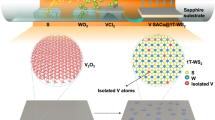 Phosphorus (P) doping can be incorporated into the S-W-S nano-layer, which reduces the electronic transition barrier, increases the density of active centers, and subsequently enhances HER33. Indeed, phosphorus creates new active sites for reactions, enhancing the catalyst’s ability to adsorb reactants and stabilize reaction intermediates. These phenomena are crucial for HER. The combination of P with WS2 can generate synergy that optimizes both the electronic and geometric properties of the catalyst41. Currently, the usual methods for preparing layered two-dimensional materials include mechanical exfoliation42,43, physical vapor deposition (PVD)44, and chemical vapor deposition (CVD)45,46. Among the methods, CVD is supposed to be one of the most promising techniques for large-scale preparation because of its high efficiency, low cost, and good quality of synthesis47,48. Additionally, CVD is a reliable approach for controlling sample quality49. To synthesize TMDCs via CVD, metal oxide powders like Tungsten oxide powder (WO3) are commonly used as tungsten sources50,51. Establishment of a low growth temperature to achieve few layer WS2 is achieved by addition of halide salts such as sodium chloride (NaCl) or potassium iodide (KI) during CVD synthesis. These promoters form volatile tungsten oxyhalides when reacting with tungsten oxide at rather low temperatures. This promotes WS2 nucleation and lateral growth on substrates through further reactions of these volatile intermediate products with gaseous sulfur. Following this principle, monolayer WS2 crystals on SiO2/Si substrates have been successfully grown at a relatively low temperature of 700–850 °C by several research groups utilizing NaCl or KI as a growth promoter with CVD52,53,54,55. Moreover, in order to enhance the quality of WS2, a trace amount of hydrogen is typically mixed into the argon (Ar) flow used in the CVD method. The mixed H2 in the Ar/H2 atmosphere serves as the reducing reagent during the reaction process56. The following are the chemical reactions happening in the synthetic process: