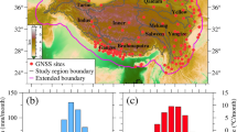 Recent advancements in satellite remote sensing technologies, notably GRACE/GRACE-FO and GNSS, have revolutionized research methodologies in this field, providing unprecedented insights into hydrological phenomena9,10,11,12,13. GRACE satellites, in particularly, excel in detecting changes in terrestrial water storage by accurately measuring minor variations in Earth’s gravity field, offering valuable data for exploring global hydrology loading displacement dynamics. However, GRACE’s sensitivity is generally limited to medium- to long-wavelength signals, posing challenges in identifying finer-scale variations in the surface gravity field. Consequently, hydrological loading signals derived solely from GRACE inversions predominantly reflect large-scale deformations and coarse spatial resolutions, lacking the granularity needed to capture localized hydrological loading deformation signals or to monitor specific hydrological events such as the closure of terrestrial water budgets in small to medium-sized river basins or the differentiation of surface mass balance from ice dynamics in individual glacier systems. In contrast, the global network of continuous GNSS stations provides highly precise, stable, and long-term geometric coordinate time series, especially for vertical displacements measured with millimeter precision. This higher precision renders GNSS data particularly sensitive to local, high-frequency loading deformation dynamics. Using internationally established independent model data, non-tidal atmospheric load, non-tidal oceanic load, and various tidal effects are removed from the GNSS vertical displacement time series, effectively extracting the contribution of terrestrial water loading. Subsequently, time series processing methods such as least squares fitting and Singular Spectrum Analysis (SSA) are employed to denoise this component and extract its primary periodic signals and long-term trend changes. Research in the domain of terrestrial water storage change and loading deformation has extensively leveraged the combined strengths of GRACE and GNSS technologies. Davis et al. (2004) analyzed time-variable gravity data from GRACE to assess surface vertical load deformation in the Amazon River Basin between 2002 and 2004, finding strong agreement with global positioning system (GPS) measurements14. Van Dam et al. (2007) used GRACE data to deduce surface loading deformations, comparing these with European GPS data and noting a subtle correlation potentially due to GPS data processing inaccuracies, which might introduce erroneous periodic signals15. Zhang et al. (2021) explored differences in seasonal surface mass load deformation as monitored by GRACE and GNSS, both regionally and at specific points16. Their analysis in the Amazon basin indicated a 30% mean discrepancy between methods, a variation likely influenced by several factors including GRACE’s data processing, geo-center motion corrections, GNSS station data’s high-frequency noise, and the choice of elastic parameters in Earth models. He et al. (2021) applied empirical orthogonal function methods to detect spatial and seasonal variations in surface deformation across five Tibetan Plateau regions, identifying a significant correlation with mass load changes recorded by GRAC17E. Similarly, Pan et al. (2021) used empirical spatial structure functions to map China’s vertical velocity fields comprehensively, refining vertical load velocity estimates with GRACE data for improved tectonic movement insights3. While considerable effort has been made to validate GRACE-derived hydrological load deformation against GNSS data and adjust GNSS elevation series to negate non-tectonic effects, advancing the integration of these geodetic techniques and developing sophisticated models is essential. Such efforts are crucial for achieving high precise regional terrestrial water storage analyses, detailed quantification of crustal elastic loading and corresponding nonlinear deformations.