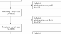Covariates were selected based on prior literature and OA risk assessment and included age, gender, race, marital status, education level, body mass index (BMI), smoking and alcohol use, PIR, and baseline medical history status (hypertension and diabetes). We categorized race into four total: Mexican American, non-Hispanic white, non-Hispanic black, and other. Marital status was categorized into two categories, widowed/divorced/separated/never married or married/living with partner. Educational level was categorized using high school as the dividing line into less than a high school degree, a high school degree, and more than a high school degree (which includes college graduates or higher).BMI was measured offline by height and weight measurements at the first interview, and was categorized as normal weight (BMI < 25 kg/m2 ), overweight (25 kg/m2 ≤ BMI < 30 kg/m2 ), and obese (BMI ≥ 30 kg/m2 ) based on BMI. Smoking status was categorized into three types, never smoked/previously smoked/currently smoked. Alcohol consumption was defined as at least 12 drinks per year.