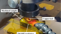 In Eqs. (1) and (2): \({\text{m}}_{\text{t}}\) and \({\text{m}}_{\text{d}}\) are respectively the mass of the workpiece that is etched (g) and the mass of the electrode that is lost during the machining process (g). \({{\uprho}}_{\text{t}}\) and \({{\uprho}}_{\text{d}}\) are the density of the Ti-6Al-4V workpiece (g/mm3) and the electrode (g/mm3) respectively. t denotes the processing time (min).