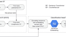 This work first encodes x, \(x^{\prime (1)}\) and \(x^{\prime (2)}\) to \(N \times L\) dimentional matrixs \(V=[v_1, \cdots , v_i, \cdots , v_N]\), \(V^{(1)}=[v_1^{(1)}, \cdots , v_i^{(1)}, \cdots , v_N^{(1)}]\) and \(V^{(2)}=[v_1^{(2)}, \cdots , v_i^{(2)}, \cdots , v_N^{(2)}]\), where \(v_i\), \(v_i^{(1)}\) and \(v_i^{(2)}\) are the L dimension embedding of i-th word in x, \(x^{\prime (1)}\) and \(x^{\prime (2)}\) in the counter-fitted embedding space34, respectively. Thus, the perturbation matrixs are \(T^{(1)}=V^{(1)} - V\) and \(T^{(2)}=V^{(2)} - V\).