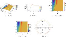 Figure 7 displays the 2D graph of the non-negative amount of the differences between solutions (19) and (20) for defined values and \(\beta = 0.90\). Additionally, Table 1 shows the absolute amount of the solutions (19) and (20) obtained using Kudryashov techniques with distinct point locations and \(\beta = 0.90\). Also, Table 2 distinctly shows the contrasts among non-negative amount of solutions (19) and (20), denoted by \(\Delta \vert \Xi (\chi , \tau ) \vert\), for fixed \(\chi\), varying amounts of \(\tau\), and \(\beta = 0.90\). It is evident that the contrasts achieved using KM I are smaller than those from KM II, indicating that the outcomes gathered by KM I have greater precision compared to KM II.