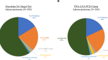 The development of other PNA-based EGFR mutation detection methods has been reported, including real-time PCR clamping technology30,31. In a study by Kim et al., genomic EGFR-mutations are detected in 34.6% of non-squamous NSCLC patients using DNA extracted from FFPE specimens, whereas DNA direct sequencing showed a positive rate of 26.3%31. These results indicate that PCR clamping is more effective than DNA sequencing in detecting EGFR-mutations. The sensitivity of our PNA probe for L858R EGFR-mutations was 100% in 11 cases harboring EGFR mutation verified by WES sequencing. This result indicates that the efficiency of the PNA probe is comparable to direct DNA sequencing.