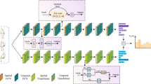 After constructing the skeleton graph, features are extracted from the nodes and edges of the graph using GCN. GCN generates node representations by aggregating features from the node itself and its neighboring nodes. In skeleton-based action recognition, GCN captures spatial relationships and temporal dynamics between joints, thus generating effective action representations. The neighbor set of a node in GCN is unordered and variable. When dealing with the topology of human skeletons, the Laplacian matrix or adjacency matrix can be used to effectively analyze the inherent properties of the human body32,33,34. The spatial graph convolution operator is defined based on the spatial relationships between the node and its neighbor set. A simple computation method is to average the features of the current node and its neighbor set. The graph is represented as \(G = \left\{ {V,E} \right\}\), where \(V\) is the set of nodes and \(E\) is the set of edges. For spatial partitioning, this work divides the neighbor set into three subsets and uses the centroid of joint coordinates as the partition center. The adjacency matrix is set as \(A\) and the degree matrix is set as \(D\). Then, it can be obtained that: