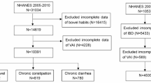 Between 2005 and 2010, NHANES introduced the Bowel Health Questionnaire to document bowel movement frequency and stool characteristics. Stool characteristics were assessed using vividly colored cards depicting the seven-point Bristol Stool Form Scale (BSFS), from which participants selected the number corresponding to their typical stool form. Bowel movement frequency was determined based on self-reported weekly counts. These data were essential for identifying individuals classified as constipated30. Our research employed two definitions of constipation31. In the first definition, participants were classified as constipated if they reported stool characteristics corresponding to type 1 (separate hard lumps, like nuts) or type 2 (sausage-shaped but lumpy) on the Bristol Stool Form Scale (BSFS). Stool types 3 to 5 were categorized as normal: type 3 (sausage-like with cracks on the surface), type 4 (smooth and soft, sausage- or snake-like), and type 5 (soft blobs with clear edges). Stool types 6 (fluffy pieces with ragged edges, mushy stool) and 7 (watery with no solid pieces) were not considered part of the normal population and were excluded from the study32. Additionally, constipation was defined based on self-reported bowel movement frequency. Participants were classified as constipated if they reported having two or fewer bowel movements per week. To minimize bias arising from different constipation definitions, we conducted separate analyses using stool form and bowel movement frequency as independent criteria. The Rome IV criteria were not applied, as NHANES lacks detailed symptom-based assessments, such as straining or incomplete evacuation, which are essential for a full Rome IV diagnosis. Furthermore, applying these criteria ensures consistency with previous NHANES-based studies and facilitates epidemiological analyses in large populations.