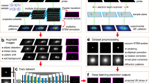 The NanobeamNN workflow significantly reduces the computational time needed to extract structural parameters from SXDM data. The experimental map shown in Fig. 4 has 165 × 165 points; calculating the correlation matrix for and fitting three parameters from 64 × 64 pixel diffraction patterns takes approximately 10 h using close to 1 TB of RAM for just one scan. To be precise, on CPU, the fitting time for one diffraction pattern is 1034 ± 19 ms. The total computation time scales linearly with the number of data points and depends on the amount of available memory. Conversely, NanobeamNN makes predictions on the same data within seconds, at a rate of 0.072 ± 0.002 ms per image, which is a factor of over 14,000 improvement. On GPU, NanobeamNN performs inference on data approximately 70 times faster than the conventional method (SI, Table 1). Moreover, once the neural network is trained, it can directly make predictions on any measurement carried out at the same X-ray energy, Bragg condition, film thickness, and detector parameters, without the need for adjustments, further reducing computational costs across multiple SXDM scans. We note that although generation of the expansive simulated dataset is somewhat computationally costly (see Methods, Simulated data generation), it is highly parallelizable and completed before an experiment, as well as being a necessary component of both the conventional correlation fitting analysis and NanobeamNN training. The time required to train the neural network and make predictions will vary depending on one’s machine; however, the network is small enough to be trained on a personal computer without the use of GPUs in a reasonable timeframe (see Methods, Neural network architecture and training).