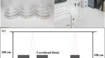 We measured PDD for the 6 MeV, 9 MeV, and 12 MeV electron beams formed by the 6 cm diameter applicator hard docked to the AQURE mobile accelerator (NCNR, Świerk, Poland)14. The applicator was fixed perpendicular to the water in the phantom, with its tip touching the water’s surface. Two measurement geometries were used. The first one included the shielding disc placed on the R90 depth: 19, 27, and 31 mm for 6, 9, and 12 MeV electron beams, respectively4. The disc was positioned parallel to the water surface and aligned coaxially with the electron beam. The EBT4 films were placed along the central axis of the beam (CAX), positioned above (from the water’s surface to the top of the disc) and below (from the bottom surface of the disc to the phantom base) the shielding disc (Fig. 1d). The second setup, which does not include the shielding disc, employs a single sheet of EBT4 film placed in the CAX from the water’s surface to the phantom base (Fig. 1c). Films were irradiated with a dose of 9 Gy defined at the points of maximum dose located below the water surface at the depths of 11, 16, and 18 mm for 6, 9, and 12 MeV electron beams, respectively4.