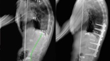 All patients were analyzed radiographically using long-cassette standing posteroanterior and lateral radiographs before operation, 2 weeks after surgery and at the latest follow-up. Radiographical analyses included T5–T12 kyphosis (TK), L1–S1 lordosis (LL), GK, osteotomized vertebral angle (OVA, for PSO, OVA was defined as the angle formed by the superior and inferior endplates of the osteotomized vertebrae; for SPO, OVA was defined as the angle between the superior endplate of the upper vertebra and the inferior endplate of the lower vertebra at the osteotomy level), pelvic tilt (PT), pelvic incidence (PI), sacral slope (SS) and sagittal vertical axis (SVA) (Fig. 1). For sagittal parameters, positive values mean kyphosis. Value of the SVA is negative if the C7 plumb line is posterior to the posterosuperior corner of S1. The corrections of these parameters were calculated by subtracting the magnitude of early postoperative (2 weeks after surgery) measurement from the magnitude of preoperative measurement. Correction loss was defined as last follow-up measurement minus the postoperative measurement.