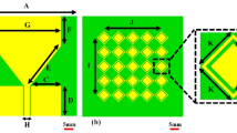The monopole antenna is designed with dimensions including a width wp and an overall length of lp + S with partial ground plane. The dimensions of monopole antenna are calculated using Eq. (1) operating at a frequency of 2.65 GHz, as shown in Fig. 1a. The ground plane of monopole antenna as shown in Fig. 1b. The operating frequency of the antenna is further adjusted to 2 GHz by etching four rectangular slots of length \(\left({l}_{s}\right)\) of 0.2λg (where λg is the guide wavelength at 2.65 GHz) along the length edges of the monopole patch as shown in Fig. 1c. The proposed slotted monopole antenna achieves a miniaturization of 37%, offers a fractional bandwidth of 20%, and provides a gain of 2.1 dBi in the operating frequency band 1.83–2.17 GHz. The operating frequency of the monopole antenna excited in its dominant mode is calculated using the following Eq. (1).
