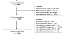 Based on previous research, common demographic, socioeconomic, lifestyle, and health-related variables were included as covariates in our study18,19,20,21. From the Demographics dataset, we obtained age (years), sex (male or female), race/ethnicity (Mexican American, Other Hispanic, Non-Hispanic White, Non-Hispanic Black, Other Race), marital status (married, widowed, divorced, separated, never married, living with partner), the ratio of family income to poverty (PIR, categorized as < 1.3, 1.3–3.5, > 3.5), and education (less than high school, high school graduate, some college, college graduate or above). Lifestyle factors included smoking exposure (≥ 100 cigarettes in a lifetime, SMQ dataset) and alcohol exposure (≥ 12 alcoholic drinks/year, ALQ dataset). For variables with “unknown/refused” responses, we excluded participants for coronary heart disease (CHD), hypertension, education, marital status, and smoking exposure due to their small proportion (< 10%), but retained alcohol consumption “unknown/refused” responses (≈ 10%) as a separate category due to potential cultural or social influences. Clinical conditions, including CHD, hypertension, and diabetes, were assessed via self-reported physician diagnoses from the Medical Conditions (MCQ) and Diabetes (DIQ) datasets. Participants with missing covariate data were excluded, except for alcohol consumption as noted.