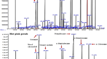 HS-SPME/GC–MS was used to collect and analyse volatile compounds15. Six intact flowers were sealed in a 20 mL extraction bottle and equilibrated at 25 °C for 60 min. A SPME fibre was used for the extraction and adsorption of volatile components over 30 min. The injection temperature was adjusted to 260 °C and a capillary column was used to separate the compounds using helium as the carrier gas at 1 mL min−1. The sample was injected in a split stream with a split ratio of 1:20. The GC oven temperature program was initiated at 50 °C with a 5-min hold, followed by a temperature ramp of 3.5 °C min−1 to 90 °C, and subsequently increased at a rate of 5 °C min−1 to 210 °C with a hold for 3 min.