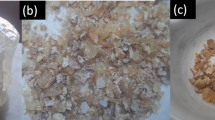 Samples containing different amounts of AA (0.5 mol) as a monomer, MBA (1.3, 2.6, 3.9, 5.2, or 6.5 mmol) as cross-linker content for producing five samples to evaluate the effect of each sample on the best gravimetric analysis, NaOH (0.5 mol) solution as prepared using distilled water as the solvent, and KPS (3.7 mmol) as radical initiator. Figure 1a. shows the free radical bulk processes for prepare NaPA and AGMA. First, prepare NaOH solution by using distilled water (7–26 wt%) at 30 °C in a 100 mL beaker, determine the weight of (AA 0.5 mol) in the anther 150 ml beaker, and immerse it in an ice flask to prevent the exothermic reaction, that might lead to Michael addition reaction. Next, pour the NaOH solution into an (AA) beaker carefully adding dropwise with continuous stirring to ensure thorough mixing after finishing the NaOH solution and leaving the mixture of NaOH/AA for ten minutes. Then, place the mixture NaOH/AA in a hot bath at 60 °C while stirring. Finally, add wt. MBA, and wt. KSP to the NaOH/AA mixture with constant stirring (5–10 min) to maintain homogeneity until the hydrogel is transformed. The samples released were dried in an oven set at 60 °C, for 24 h, and put the samples in liquid nitrogen and grind for powders. The resulting products, a (hydrogel #1) referred to as NaPA with five different samples products released different cross-linker content, (wt.) was formed as shown in Fig. 1b. The resulting products, a (hydrogel #2) referred to the same synthesizing processes, but the different step added GMA to AA with ratio (1:1) as AGMA with five different samples products released samples were the pictures of the AGMA samples products released was formed as shown in Fig. 1c, and the NaPA or AGMA samples with weight (50–60) grams after grinding into powder.
