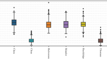 We perform three unit root tests to verify stationarity. For the Augmented Dickey–Fuller test, we use a regression model based on the first-differenced series \(y^{\prime}_t\left( {y^{\prime}_t = y_t - y_{t - 1}} \right)\) that includes several lags represented by (k) where the coefficient ø = 0 if \(y^{\prime}_t\) is stationary (Eq. 2). For the Phillips–Perron test, we use a regression test where u t is the alternative null hypothesis (H1) and may be heteroskedastic (Zivot and Wang, 2007) (Eq. 3). For the Kwiatkowski–Phillips–Schmidt–Shin test, we break the time series into stationarity and random walk components (Hyndman and Athanasopoulos, 2013; Panas, 2001) (Eq. 4 and 5). Here D t contains deterministic components, u t corresponds to H0 and μt is a pure random walk process with variance \(\sigma _{\it{\epsilon }}^2\). We test the score statistic \(\sigma _{\it{\epsilon }}^2{\mathrm{ = }}0\) against the alternative that \(\sigma _{\it{\epsilon }}^2{\mathrm{ > }}0\) (Eq. 6) (Zivot and Wang, 2007).