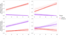The Hypothesis 1 states that religiosity should lead individuals to higher levels of trust and large-scale cooperation. The structural parts estimated by the EVS (Table 1a and Fig. 1a) and the WVS models 1 (SM Table S4.a and SM Fig. S1.a) show the opposite. In the EVS model 1, respondents high on the latent Religiosity are also high on the latent Social mistrust, while they are low on the latent Large-scale cooperation. The same pattern emerges from the WVS model 1. Even though these associations are weak (the percentage of variance in Social mistrust and Large-scale cooperation explained by Religiosity is respectively of 8 and 4% in the EVS model 1, and 3% in the WVS model 1, see Table 3), they are nevertheless robust to sampling noise injected by the cross-validation procedure. In sum, the respondents who display the highest levels of religiosity are slightly more likely than others to mistrust unfamiliar people, to reject more social categories as potential neighbors, and to undertake less actions benefiting the large-scale community. Note that in both models, Social mistrust and Large-scale cooperation negatively covary: respondents displaying the highest levels of mistrust show the lowest level of large-scale cooperation.