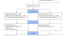 Figure 1 presents a flowchart describing the participant recruitment process. The participants to be surveyed were recruited through the Board of Education of six cities (Fukui City, Sabae City, Katsuyama City, Sakai City, Komatsu City, and Shimizu City) in the central region of Japan. A total of 2297 students from nine public primary schools participated. The headteachers of five of the nine schools chose to participate in the intervention group, which comprised 1151 students. Further, written consent from the headteachers, teachers, and parents of 954 students were obtained. The 954 students received the TFP and participated in a KINDL-R questionnaire survey (see ‘Measurement’ for details). The headteachers of four of the nine schools chose to participate in the control group, which comprised 1146 students. Written consent was obtained from the headteachers, teachers, and parents of 766 of these students, to whom the KINDL-R questionnaire survey was then administered. No school in the intervention group dropped out during the study, while one school from the control group withdrew during the intervention process. A drop-out notice from the headteacher because of the school’s circumstances unrelated to the TFP was received. Absent participants and those who did not complete the KINDL-R were excluded. The analysis included 794 participants (387 boys and 407 girls) in the intervention group, and 592 participants (299 boys and 293 girls) in the control group (Fig. 1). The students who were analysed were in the second, third, fourth, fifth, and sixth grades of primary school (Table 1). The mean age at the baseline was 9.04 and 9.27 years in the intervention and control groups, respectively. In Japan, primary school runs from grade 1 to grade 6, and children who have their sixth birthday on or before 1 April enter the first grade of the primary school of that year (i.e., the school year starts in April and ends in March). At the beginning of April, the second graders are 7 years old, and the sixth graders are 11 years old. Grades 2 to 6 were chosen because the TFP includes writing activities that the 1st graders have not yet learned.