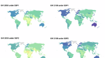 We employ the Gini coefficient to assess the evolution of global well-being distribution between countries from the past decades (1970–2010) to the projected future under five SSP scenarios (2015–2100). The Gini coefficient, calculated as half of the relative mean absolute difference of all pairs of country samples in each year, varies from 0 (complete equality) to 1 (complete inequality) (Farris, 2010). With i and j representing two countries from a total of \(n\) countries, we quantified the Gini coefficient for global well-being in year t in Eq. 6.