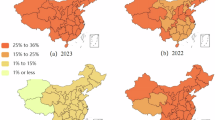 where \({y}_{i}\) is a dependent variable via a linear function of a set of \(p\) independent variables, \({x}_{1}\),\(\,{x}_{2}\),\(\ldots \ldots ,{x}_{p}\); \({\beta }_{0}\left({u}_{i},{v}_{i}\right)\) is the regression coefficient at point \(i\), which indicates the degree of influence of the independent variable on the dependent variable; \(\left({u}_{i},{v}_{i}\right)\) is the geographic center coordinate of the \(i\) sample point; \({\beta }_{k}\left({u}_{i},{v}_{i}\right)\) is the sample value of the continuous function, \({\beta }_{k}(u,v)\) in the sample space at point \(i\); \({x}_{{ik}}\) represents the value of the independent variable \({x}_{k}\) at point \(i\); and \(\varepsilon\) is the normal distribution function with constant variance, which represents the random error term.