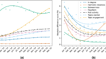 From the digital trace data available, we defined the forums’ communication networks as multiplex, in the sense that each first layer pertained to public communications, each second layer to private messaging, and each flattened network represented the combination of the two layers (see also Halu et al. 2013 for a similar multiplex network). Public communications are organised in threads that consist of an initial post, which can be followed by one or more replies. While most replies are direct answers to the thread starter, users can also reply directly to another user’s reply. From these posts and replies, we constructed the public replies networks; directed networks in which nodes represent forum members, in-coming edges represent replies received, and out-going edges represent replies sent. This meant that n = 728 users who only posted one or more original posts yet received no replies and also never replied to public contributions of others were excluded from the network of forum A, and n = 268 from forum B. With this definition of the network architecture, we captured all directed public communications on the forums, while purposefully ignoring undirected communications (i.e. thread starters). For a similar reason, all loops were removed for the social network analyses. Even though it seems intuitive that users can reply to their own posts, the goal of the analyses was to quantify users’ interactions with others, and therefore loops would have biased the results insofar as the degrees would not have exclusively reflected social interactions with others.