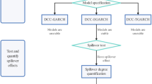 This study estimates the conditional volatilities of SPY and IYR using the GARCH model referencing Bollerslev (1986). Specifically, this study employs the GARCH(1,1) process, which fits well in financial studies (Kola and Kodongo, 2017; Lahmiri et al., 2018). Considering the return series \({r}_{t}=\mu +{\epsilon }_{t}\), where \(t\), \(\mu\), and \({\epsilon }_{t}\) respectively denote the time index, conditional mean, and error term, the conditional volatility (\({h}_{t}\)) is obtained by \({h}_{t}=\omega +\pi {\epsilon }_{t-1}^{2}+\gamma {h}_{t-1}\). Here, \(\pi\) and \(\gamma\) are the coefficients of the error term and conditional volatility at time \(t-1\), and \({\epsilon }_{t}={\phi }_{t}{\epsilon }_{t-1}+\,{\eta }_{t}\) with standardized residual \({\eta }_{t}\) (Zolfaghari et al., 2020).