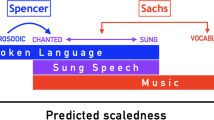 We reported a correlation between a structural property of musical scales and a physiological feature of the way that people sing them. More specifically, we observed an increase in the mean interval-size of the scales as the degree of pitch-class imprecision in the singing style increased. In addition, larger scale-intervals were found to be more prevalent in the smaller-scale cultures than in the larger cultures (see Fig. 5), where the latter have more semitones in their scales. A previous study by Sato et al. (2019), looking at a much smaller corpus of 50 vocal songs, found a similar type of correlation. In their case, they observed a significant negative correlation between pitch-class imprecision and the number of scale tones (r = −0.23). We observed negative correlations of similar magnitude (Pearson’s r = −0.25,p < 0.001, n = 411, at the song level; r = 0.61 p < 0.06, n = 10, at the region level). Since the size of a scale tends to be inversely related to the mean interval-size (see Table 1), these correlations with vocal imprecision are not surprising. However, the positive correlation that we observed between mean imprecision and mean interval-size was larger in magnitude (Pearson’s r = 0.49, p < 0.001, n = 411).