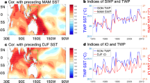 In recent decades, a change in the ENSO anomaly pattern, referred to as the Central Pacific (CP) ENSO (or ENSO Modoki), which is distinct from the familiar Eastern Pacific (EP) ENSO (canonical ENSO), has gradually become apparent66,67. The gradient pattern of sea surface temperature (SST) anomalies (SSTA) of El Niño Modoki leads to a different pattern of propagation and dissipation of ultralong Rossby waves in the middle-latitude stratosphere that can affect the stratosphere, unlike the case for the canonical El Niño. Thus, the climatic effects of ENSO Modoki on stratospheric circulation are different from those of the canonical ENSO50,63,68,69,70,71,72,73,74,75. The variations in convection and circulation patterns resulting from SSTAs have been shown to significantly influence tropopause temperatures76. Walker circulation patterns and the effects of convection anomalies caused by El Niño Modoki activity can extend to the TTL. Xie et al.50 found that ENSO Modoki caused changes in the tropopause temperature and SWV anomalies, although the influence of ENSO Modoki is smaller than that of the canonical ENSO. Ding and Fu77 also presented observational and modeling evidence that the epochal change of water vapor between 1992–2000 and 2001–2005 was also partly caused by a concurrent SST warming in the tropical central Pacific. This SST warming cools the TTL78 overhead by enhancing equatorial-wave-induced upward motion near the tropopause, which consequently reduces the amount of water vapor entering the stratosphere. Thus, ENSO Modoki is also an important process controlling LSWV changes on interannual time scales.