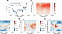 We used delayed-time (reprocessed) daily SLA data for the 1993–2015 period with a spatial resolution of 0.25°, obtained from Copernicus Marine Environment Monitoring Service (CMEMS)83. These data are derived from various satellite missions using an altimeter, and they contain Jason-3, Sentinel-3A, HY-2A, Saral/AltiKa, Cryosat-2, Jason-2, Jason-1, T/P, ENVISAT, GFO, and ERS1/2. The Ssalto/Duacs altimeter products were produced and distributed by the CMEMS (http://www.marine.copernicus.eu). In the present analysis, we have used monthly averages computed from the daily CMEMS data. Moreover, monthly interpolated temperature and salinity profiles from Met Office Hadley Centre observations (EN4) datasets84 are used to compute D20, DH, and OHC with respect to 300 m during the study period. This EN4 version of data is quality-controlled and has the spatial resolution of 1°, with 42 depth levels ranging from 5 to 5250 m84. SLA data were regridded to the EN4 grid to carry out the analyses over 10°S–10°N and 40°E–100°E. OHC is derived from the surface to 300 m of the ocean subsurface using equation (1)49