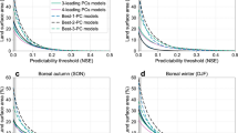 where \(\sigma _{\mathrm{sig}}^2\) is the temporal variance of the model ensemble mean, and \(\sigma _{\mathrm{tot}}^2\) is the average of the temporal variance of individual ensemble members. For observations, PCobs is approximated as the temporal Pearson correlation (r) between the observation and the ensemble mean. A comparison of PCobs and PCmod can distinguish whether a model is overconfident (PCobs < PCmod) or underconfident (PCobs > PCmod) in its predictions.