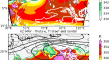 Similarly, based on the dipole mode index (DMI)29 during the IOD peak season (September-November), there were 11 positive and 9 negative IOD years during the analysis period. The average frequency of LLC dropped by 42% during positive IOD years and increased by 41% during negative IOD years. The interannual variability in the frequency of LLCs is much more visible and significant than the frequency of the total TCs and HLCs developed over the BoB. The frequency of LLCs during El Niño and positive IOD years is fewer than the climatological mean. On the contrary, the frequency of BoB LLCs is higher than the climatological mean during La Niña and negative IOD years. The average number of HLCs during all categories of ENSO and IOD years does not vary much (close to the climatological mean) except for negative IOD years, when the frequency of HLCs is increased by 38% from its climatological mean (Table 2). Although the frequency of LLCs shows association with ENSO and IOD variability, the intensity of LLCs does not show significant teleconnection. Around 70-83% LLCs have intensified into SCSs and higher categories considering all phases of ENSO and IOD (Fig. 2). However, only 50–67% HLCs have intensified into SCSs and higher categories (Fig. 2). Consistent with previous studies31, the frequency of TCs in the BoB is higher during La Niña years and fewer during El Niño years (Fig. 2 and Table 2). However, the HLC frequency barely changed during the contrasting phases of the ENSO. For example, the average number of HLC remains the same (≈1 TC per year) for La Niña and El Niño (Table 2). On the other hand, the frequency of LLCs of ≈1 TC (per year) during La Niña has declined to ≈0.3 TC (per year) during El Niño (Table 2). A similar relationship is found for severe cyclonic storms (SCS), where the changes in TC frequency are dominant in the low latitudes (Fig. 2). Hence, the change in TC frequency in the BoB during different phases of El Niño is dominated by the change in the low latitudinal regions. Overall, this analysis clearly shows that the reduction in TC frequency during El Niño and increase in TC frequency during La Niña is almost entirely due to changes in LLC frequency. For different phases of IOD, there is a change in HLC frequency as well, but the change in LLC frequency is more prominent (Fig. 2 and Table 2). This observation motivates us to find the underlying causes behind such latitudinal contrasts.