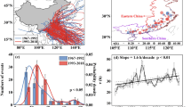 Landfalling track modes are evidently subjected to the peripheral large-scale steering flow associated with the subtropical high (Fig. 5). The weakening (eastward retreat) of subtropical high over the North Atlantic shifts the tropical cyclone activity eastward such that more tropical cyclones made landfall on Caribbean Islands, Yucatan Peninsula, Florida, and United States East Coast in the non-“hard-strike” modes. This is consistent with the increase in τ of strong North Atlantic landfalling tropical cyclones (landfall intensity ≥64 kt) over the recent decades (Fig. 1). Conversely, the strengthening (westward extension) of the subtropical high over the western North Pacific shifts the tropical cyclone activity westward, which is consistent with the westward shift of the western North Pacific tropical cyclone tracks found during 1982–201811, resulting in more “hard-strike” landfall events on China. This agrees well with the decrease in τ of strong western North Pacific landfalling tropical cyclones (landfall intensity ≥64 kt; Figs. 1 and 2) over the past decades. The attribution to the change of North Atlantic subtropical high is not yet clear whereas that over the western North Pacific is suggested to be partly due to the atmospheric response to the observed Indian Ocean–western Pacific warming20.