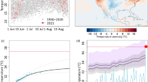 A sensitivity analysis was performed to test how different starting years affected the emergence of trends in the persistent snow zone, the Portland International Airport, and additional stations in the ≥+5 °C metric through 2021 (Fig. 4 and Supplementary Fig. 5). Trends were derived in R using the simple linear regression model: \(Y={\beta }_{0}+{\beta }_{1}X+\epsilon\), where \(Y\) is the value for the ≥+5 °C metric, \(X\) is the year of each AMJ period, and \({\beta }_{0}\), \({\beta }_{1}\), and \(\epsilon\) represent their traditional coefficient and error terms. Heteroscedasticity-consistent standard errors were implemented to address mild heteroscedasticity in the model (viz., recent extremes in 2016, 2021) using lm_robust() with se_type = ”HC3” (appropriate for smaller sample sizes) in the estimatr package. The slopes for all starting years from 1940–2010 are shown in Supplementary Fig. 7. For the six locations with trends calculated, except for a 1–4 year period in the mid-1980s in three of the locations, all years and locations show a positive trend in this metric for all starting years between 1940–2010. Across all long-term station records measured, for starting years 2010 and prior (see Supplementary Table 1 for record periods), 92% of trends are significant at the p < 0.1 level, and 81% at the p < 0.05 level, with most significance failures confined to a window from the late 1970s–early 1990s. The trend from 1993–2021 was chosen for emphasis and plotting in Fig. 4 due to the relative strength and significance of the trend from that year onwards, but similarly strong trends could be initiated at any point in the mid-1990s. Future research will be better equipped to ascertain this trend’s robustness more definitively. Trend emergence in the mid-1990s appeared relatively consistently, supporting the decision to fit a trend to this period and highlight it in our analysis. A positive trend in the intensity and/or frequency of extreme heat anomalies, insofar as they would emerge with greater regularity in a warm-shifted climate, is also better accounted for by the greater degree of warm-shifting that has manifested in more recent decades. Trend emergence in the mid-1990s is also more in agreement with natural modes of variability. The decade prior to then was unusually warm in spring due to what has been described as a Pacific-North American-like teleconnection81, but which oscillated in the mid-90s to its opposite phase that would typically contribute to cooler spring temperatures. Instead, a positive heatwave trend began in the opposite sign of this teleconnection influence, suggesting factors besides natural variability (e.g., an anthropogenic warming trend) emerged to dominate near this inflection point. This rationale was also applied to derive the trend in the PRISM record (Fig. 4b), although due in part to the greater variability in temperature anomalies at altitude, as well as the more limited time record (n = 40 years, 1981–2021), this trend is much more sensitive to starting year, only demonstrating significance at the p < 0.05 level in 1995, and at the p < 0.1 level for most of the 1990s and post-2004.
