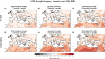 First, we calculated the precipitation minus evapotranspiration (PME) time series for each grid point and got the time series of monthly anomalies of PME over each grid cell by subtracting the respective calendar month mean (1980-2020 for ERA5, 1980–2014 for CMIP6) from each month’s value. Then, we calculated moisture deficit based on 12-month cumulative anomalies of PME, and analyzed the impacts of PME on droughts. The contiguous areas defined by adjacent grid cells that show a 12-month cumulative anomalies of PME threshold below the 20% were defined as drought clusters if their area was in excess of 10,000 km2. It is worth noting that we build empirical cumulative distributions using the time series of 12-month cumulative anomalies over each grid cell, and replace the value of each grid time series with the respective percentile. After defining such drought clusters, we characterized a single drought event as a 3-dimensional object with longitudinal and latitudinal extent, as well as time of occurrence. The 3-dimensional contiguous drought clusters with overlapping grid cells linked by the Lagrange tracking algorithm15,59 were defined as drought events. The drought lusters must last at least 3 months and we remove all clusters that last less than 3 months.