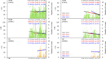A total of 148 landfalling TC events during 1967–2018 over China were selected based on the selection criteria (see “Methods” section). The decay timescale τ, a parameter used to characterize the decay rate of TC intensity (i.e., greater τ values indicate a slower decay after landfall), was calculated for each landfalling TC event7,18. To prevent the influence of outliers, 7 landfalling TC events with exceptionally large τ values (greater than twice the standard deviation above the mean) were excluded, and finally 141 landfalling TCs were used to analyze the changes in decay timescale in this study. The tracks and τ values of 141 landfalling TCs are shown in Fig. 1a, b, respectively, for the two half periods (1967–1992 and 1993–2018). Spatially, TCs with greater τ value are more likely to appear in eastern mainland China (EC) where, for example, the number of TCs with τ value larger than 40 h is 16, which is three times the number (i.e., 5) in southern mainland China (SC; Fig. 1b). The probability density functions (PDFs) of τ during 1967–1992 and 1993–2018 show that the PDF of τ in the second period (i.e., 1993–2018) is significantly shifted toward higher values compared to the first period (i.e., 1967–1992), indicating a greater probability for τ reaching higher values in 1993–2018 than in 1967–1992 (Fig. 1c).