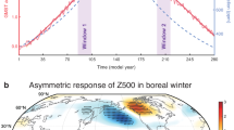 The VM index is defined as the second principal component (PC2) associated with the second empirical orthogonal function (EOF2) mode of SST anomalies in the North Pacific poleward of 20°N21. It is noteworthy that the VM is partly forced by the North Pacific Oscillation (NPO) atmospheric variability21,40. To remove the effect of the NPO and isolate the internal variability of the VM, linear regression was conducted with respect to the November–April (NDJFMA) averaged NPO index prior to analysis. The NPO index is defined as the PC2 associated with the EOF2 of SLP anomalies over 20°–60°N, 120°E–80°W40. The NTA index is defined as the averaged SST anomalies in the NTA region (0°–20°N, 80°–20°W). The Niño3.4 index, which is used to represent ENSO variability, is defined by SST anomalies averaged over the 5°S–5°N, 170°–120°W region. To isolate the climatic influence of the VM and NTA SST independent of ENSO, the effect of the simultaneous winter’s ENSO has been removed from the VM and NTA indices, respectively, using linear regression with respect to the Niño3.4 index. The NAO index is obtained from the National Oceanic and Atmospheric Administration (NOAA) Climate Prediction Center website (http://www.cpc.ncep.noaa.gov/data/indices). These indices from 1950 to 2021 were all linearly detrended and standardized using population standard deviation (SD).