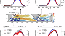 To understand why there are temporal asymmetries of changes in GPI in the selected sub-regions, we examine the changes in each parameter (Fig. 2d–o). We also performed a sensitivity analysis by changing one variable at a time to examine which environmental factor(s) have strong impact on the temporal asymmetry of the changes in the logarithm of GPI (Table 1 and Method). The contribution calculated in Table 1 is the average influence across the whole respective sub-regions. Changes in the mid-level relative humidity explain most of the late season shift of TC genesis date in WNP I, WNP II, and WNA, and have relatively significant influence in ENP. Changes in deep-level wind shear are most important to the late-season shift in ENP and contribute to the late-season shift of TCs in WNA and ENA. Changes in potential intensity are important for the late season shift in ENP and ENA, while the change in low-level vorticity is the sole dominant factor for the early season shift of TC geneses in WNP III, as the impacts of Vp, RH, and SHR are low and cancel each other. In the following sections, we will examine the large-scale circulation features that influence the changes of these parameters in their high-impact sub-regions.