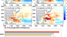 The western North Pacific (WNP) is the most active basin for tropical cyclone (TC) activity. As such, TCs that form in WNP during June–November often result in massive fatalities and economic losses in densely populated East Asian countries. Previous studies have extensively explored the relationship between WNP TC activity and climate modes of variability at various timescales1,2,3,4,5,6,7,8,9,10,11,12,13,14,15,16,17,18,19,20,21,22. At the interannual timescale, in particular, it is well-established that WNP TC activity is largely modulated by the El Niño-Southern Oscillation (ENSO)9,10,12,23,24,25,26,27. Specifically, during the positive phase of ENSO (i.e., El Niño), the genesis location of WNP TCs shifts southeastward, and the likelihood of intense TCs forming in the deep tropics increases. During the negative phase of ENSO (i.e., La Niña), on the other hand, the genesis location of WNP TCs shifts northwestward and the likelihood of TC landfalls over the East Asian countries increases9,10,12,23,25.