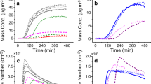 where \({P}_{{loss},\,\Delta t,j}\) is the loss of aerosol particles in the size bin j within time \(\triangle t\). \({P}_{t,j}\) is the suspended particle number concentration in the size bin \(j\) at time t, \({k}_{{wall},j}\) is the particle wall loss rate of size j. Note that the particle wall loss rates of AS and ABS seed particles were only applied for the experiments that used AS or ABS as seed particles, respectively.