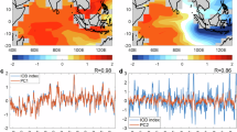 The ENSO typically develops during boreal summer, reaches its peak in winter, and dissipates by the following spring (hereafter, the seasons follow those in the Northern Hemisphere)1,2. IO variability is strongly influenced by the ENSO15,16,21,22,23,24,25. During the ENSO development phase, the IOD is often triggered in spring and co-evolves from summer to autumn. The IOD usually peaks in late fall and decays rapidly due to the seasonal reversal of the monsoonal winds6,7. In winter, the IOD fades as its damping process dominates, but the continued influence of the ENSO causes the development of the IOB through thermodynamic and dynamic processes14,26,27,28. The dynamic process includes the effect of oceanic Rossby waves induced by the ENSO in the equatorial southeastern IO that propagates to the southwestern IO17,29, whereas the thermodynamic process is dominated by the anomalous surface net heat flux4,30. The IOB develops during the mature phase of the ENSO, peaks in early spring, and persists during summer27. Specifically, El Niño (La Niña) is predominantly associated with a positive (negative) IOD and IOB. Consequently, the ENSO is recognized as the primary driver of IO climate variability.