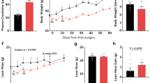 Mice subjected to UNX at an early age (4 weeks old) and subsequently exposed to a customized WD, rich in fat and sugar together with 4% salt, did not display significant changes in body weight compared with controls, regardless of whether the mice were fed the diet for 12 or 20 weeks (Fig. 1a). This finding is similar to what was previously reported for the consumption of high-salt diet21. However, there was a significant increase in fat mass after 20 weeks of diet compared with sham mice (P < 0.05, one-way analysis of variance (ANOVA) and Tukey’s multiple comparison test), coupled with a reduction in lean mass at both time points (Fig. 1b and Table 1).